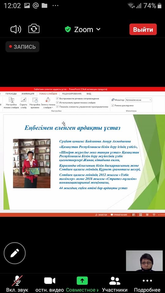 5-7 сынып оқушылары математика пәні мұғалімі Баймағанбетова А.К. ұйымдастыруымен өткен «Еңбегімен еленген ардақты ұстаз» атты онлайн-сұхбатқа қатысты.Сұхбат қонағы ҚР Білім беру ісінің үздігі, Қарағанды облысы Білім басқармасының және Сәтбаев қаласы әкімінің Құрмет Грамотасы иегері, «Үздік тәлімгер» және «Стратег мұғалім» номинациясының жеңімпазы, есімі «Шәкірт жүрегіне жол тапқан ұстаз» ҚР Білім беру жүйесінің үздік қызметкері жинақ кітабына енген,44 жылдық еңбек өтілі бар ардақты ұстаз Байзакова Акнур Ахмедиевна оқушыларға математика мамандығына келу жолындағы өмір баспалдақтарымен,өнегелі өмірімен бөлісіп, математика пәнінің адам, қоғам өміріндегі рөлін оқушыларға айшықтап берді. Оқушылар өздерін қызықтырған сұрақтарын қойып,үлгілі ұстаздың тәлім берер әңгімесінен көп ой түйді. 8-9 сынып оқушылары математика пәні мұғалімі Бегаева А.О. ұйымдастыруымен еңбегі еленген зейнеткер ұстаз, математика пәнінің білікті маманы Гладкова Галина Николаевнамен кездесті. Кездесу оқушыларға үлкен шабыт, болашаққа бағдар сілтеді. Математика пәнінің ғылымның қай саласынан да орын алып қоймай, күнделікті өмір сүру дағдымыздың бір бөлшегі екенін оқушылар жете түсінді.