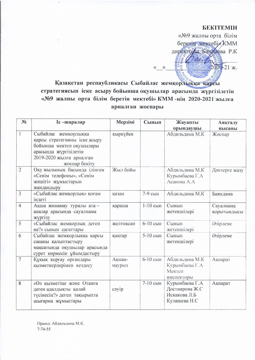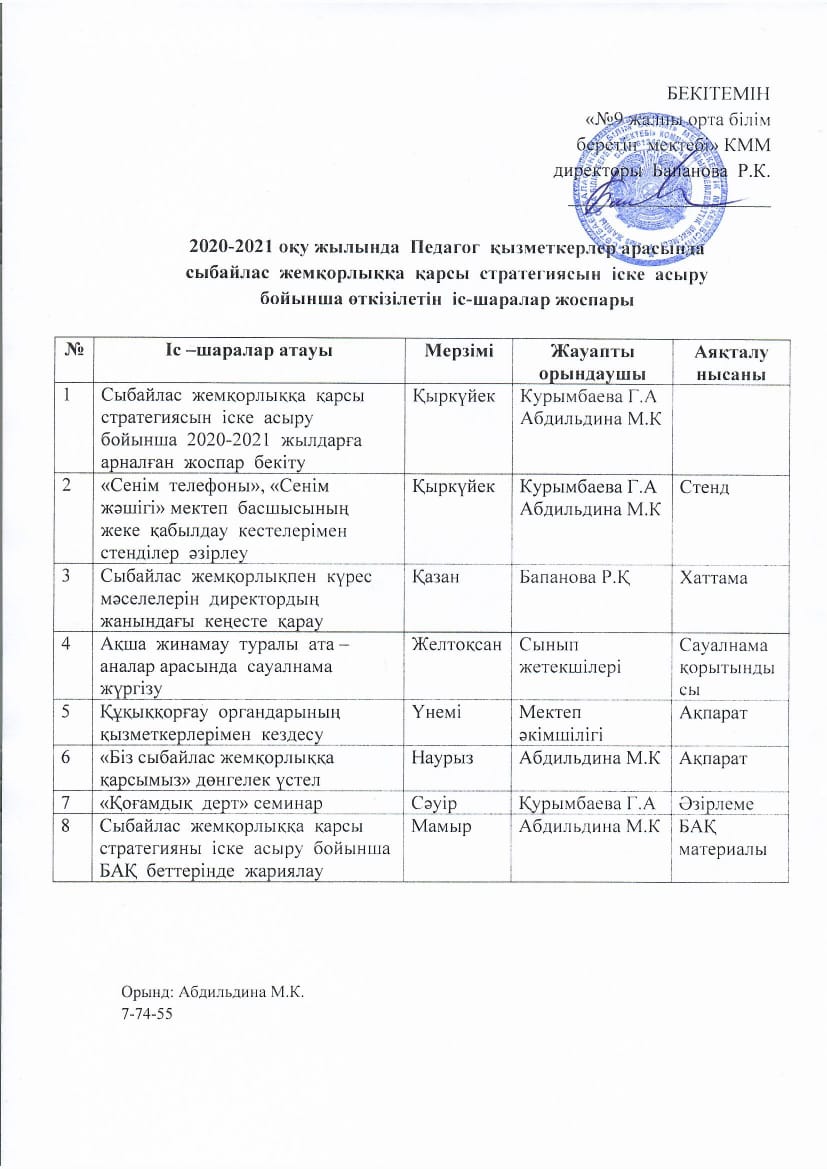 | 1 | Сыбайлас жемкорлык жоспары |